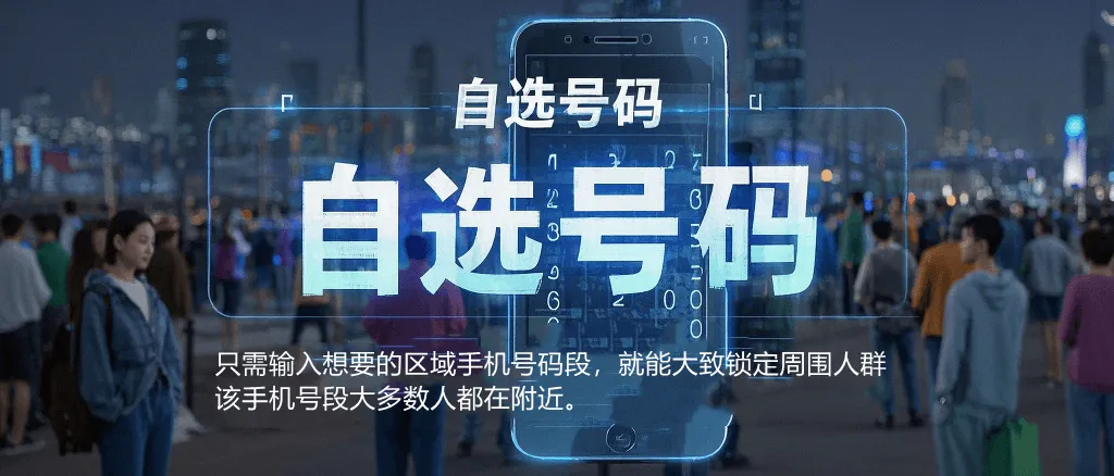 自选号码,只需输入想的区域手机号码段,就能大致锁定周围人群,该手机号段大多数人都在附近。