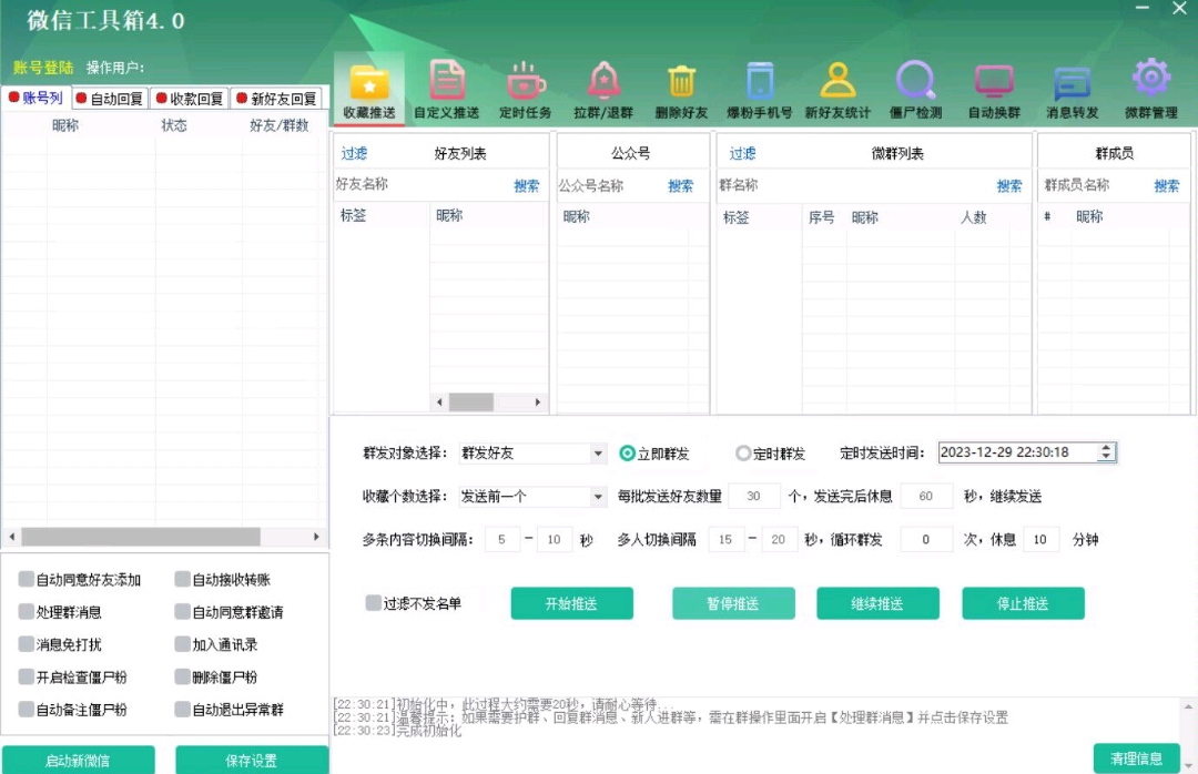新好友回复:当有新好友添加您时,系统自动回复预设的消息。