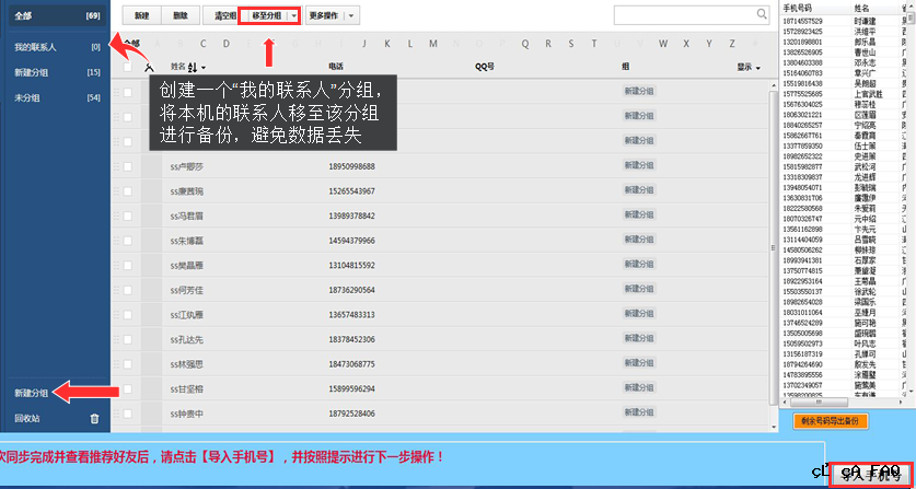 8、使用前请先将本机联系人备份,新建一个“我的联系人”分组,将本机的联系 人移至分组“我的联系人”作以备份。