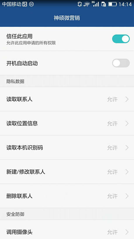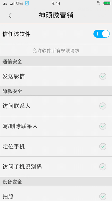 手机管家—权限管理—应用—神硕微营销—信任此应用