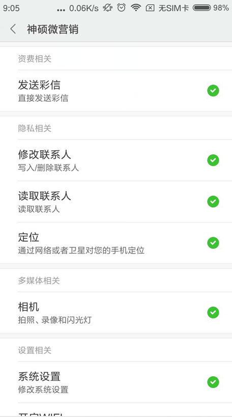 手机管家—权限管理—应用管理—神硕微营销—权限全部开启