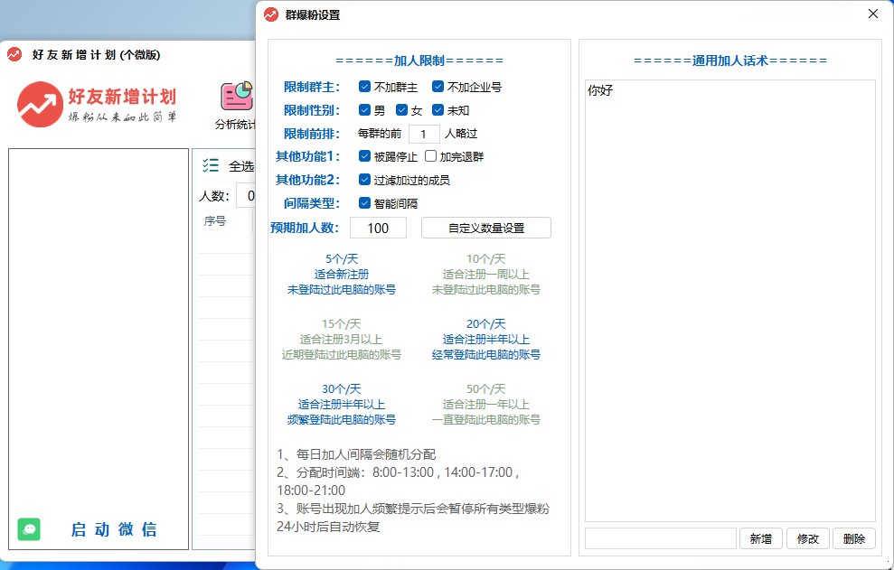 以及真实用户深度测评反馈——“好用么?92.6%的长期用户持续续费使用!” 功能方面,软件支持7×24小时无人值守挂机添加,涵盖群内智能抓取活跃群友、本地通讯录/Excel表格导入微信号、三大运营商手机号一键匹配加粉、QQ号反查微信、Wxid精准直连等多种拓客路径;可自定义日新增目标,后台自动均衡间隔(30s–5min可调),规避平台风控;内置20+条情景化随机验证话术库,支持按行业/人群动态切换;更配备可视化数据看板,实时追踪当日、7日、30日各渠道(群聊/手机/导入等)通