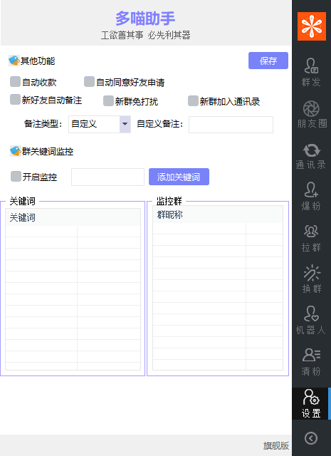 微信护群功能:在微信群管理方面,多喵助手旗舰版非常强大。非管理拉群踢人、新人进群不加群主就踢人,还有发文字、图片、视频、链接等违规行为秒踢,加入黑名单秒踢,全方位守护群秩序。