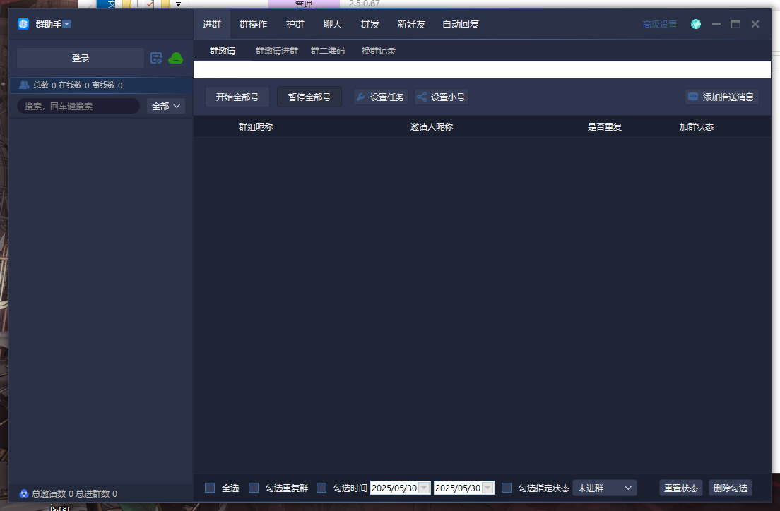 归属感。 更进一步,软件还搭载了**全自动成员邀请—进群—换群—护群闭环管理系统**:支持按规则自动向好友列表/通讯录/标签分组批量发起邀请;智能判断群满员/失效/封禁状态并自动